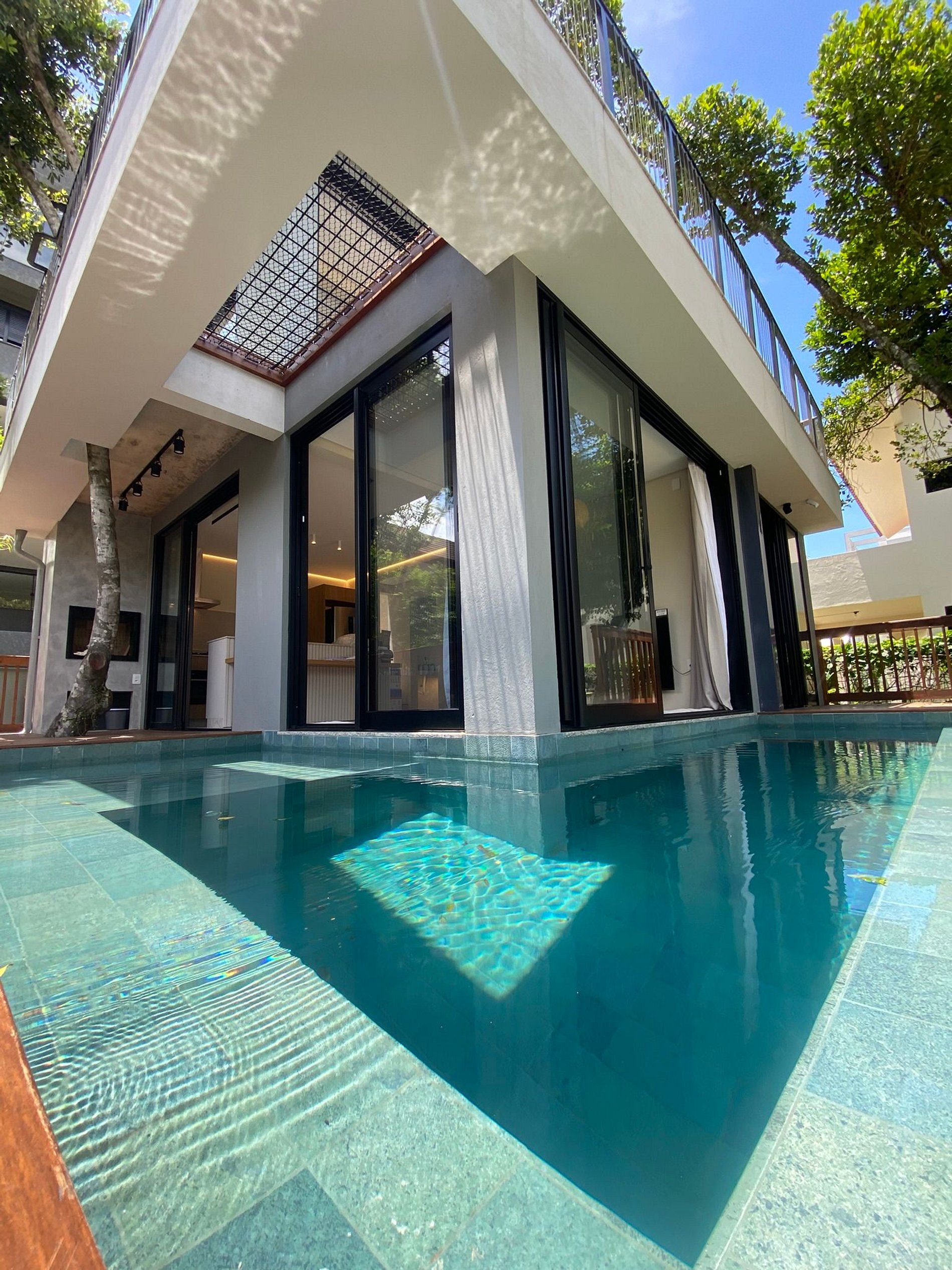 Inspirada na arquitetura balinesa contemporânea, a casa foi pensada para reunir pessoas com conforto e leveza. A piscina abraça a área social — cozinha integrada e sala de TV — e se conecta à churrasqueira e ao jardim, formando um ambiente de entretenimento fluido. Árvores atravessam as sacadas, a ventilação é naturalmente eficiente e a luz do sol percorre os ambientes ao longo do dia.