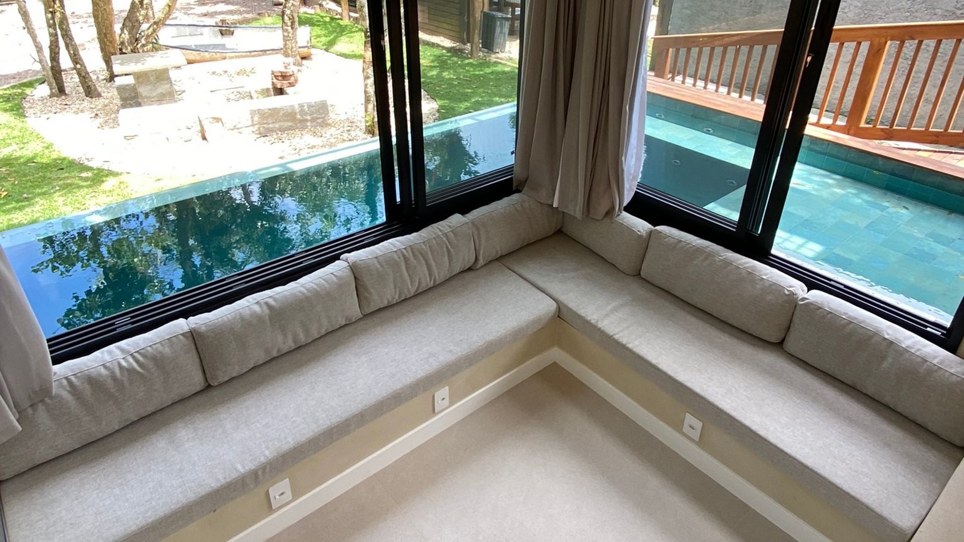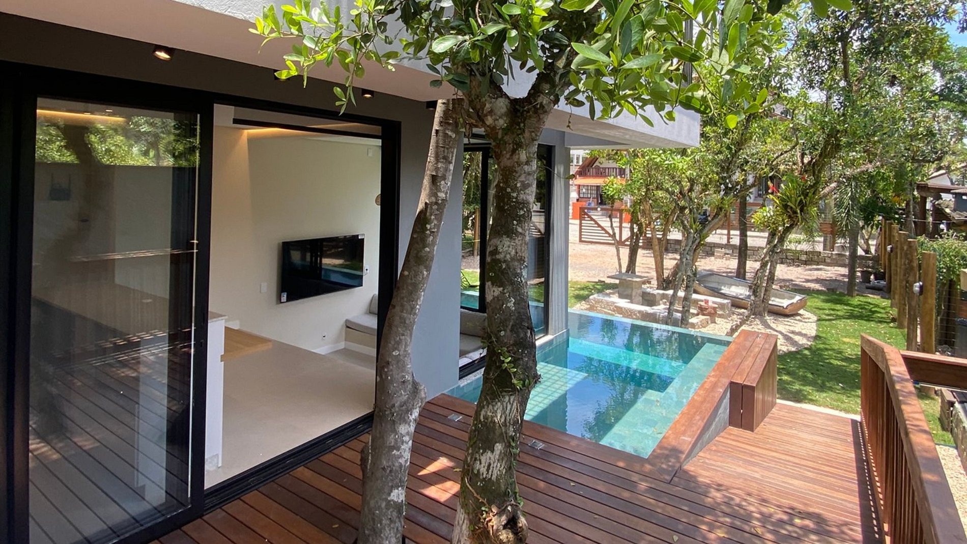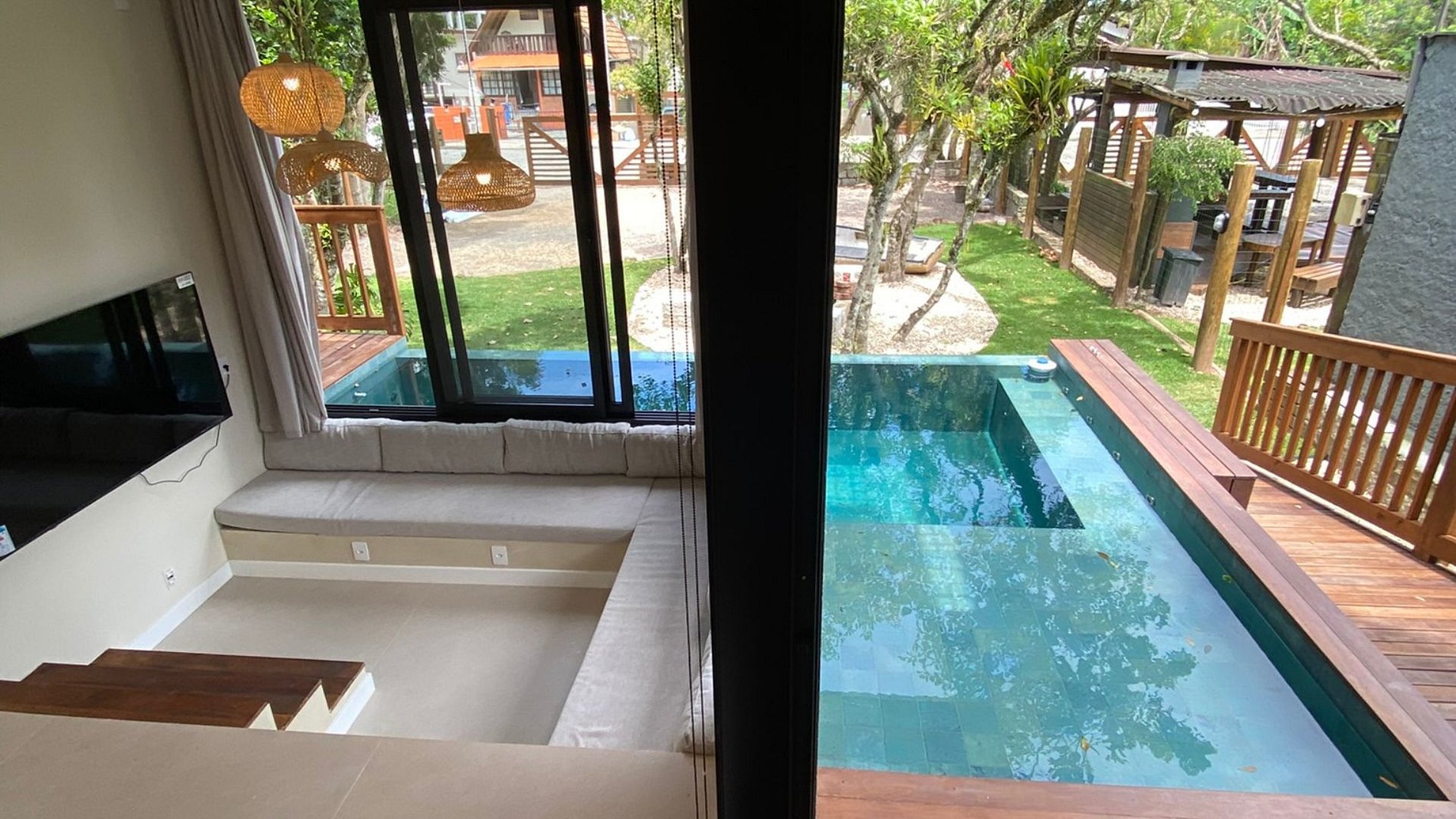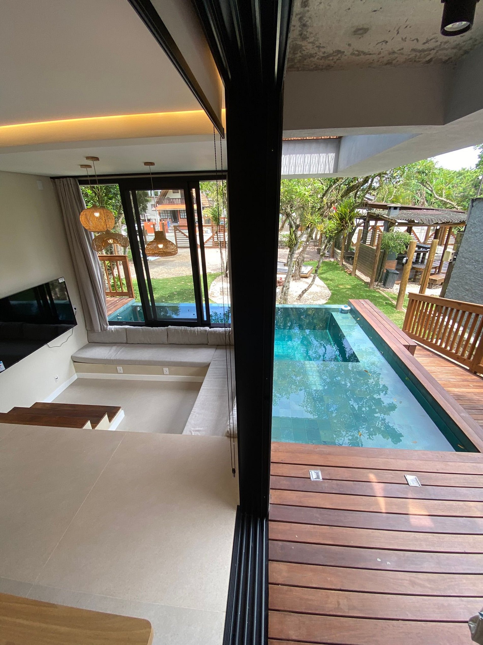 Piscina ao redor da sala + churrasqueira + jardim: social fluido e arejado