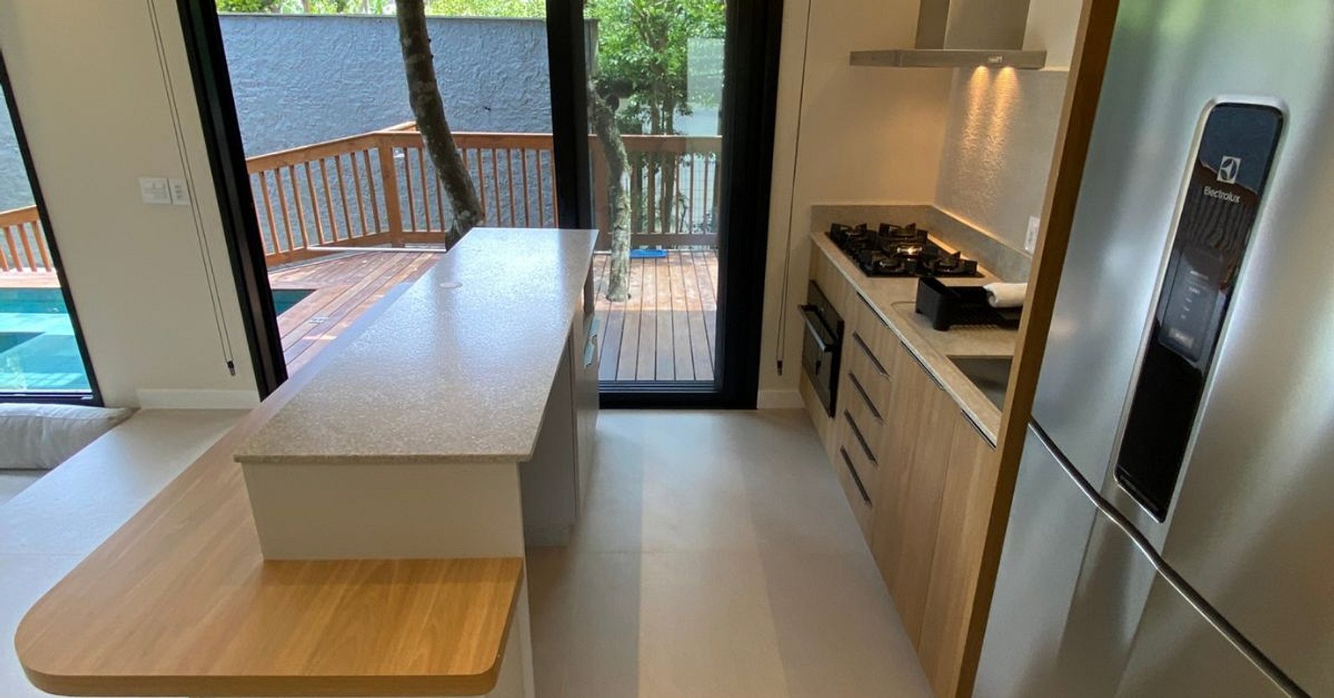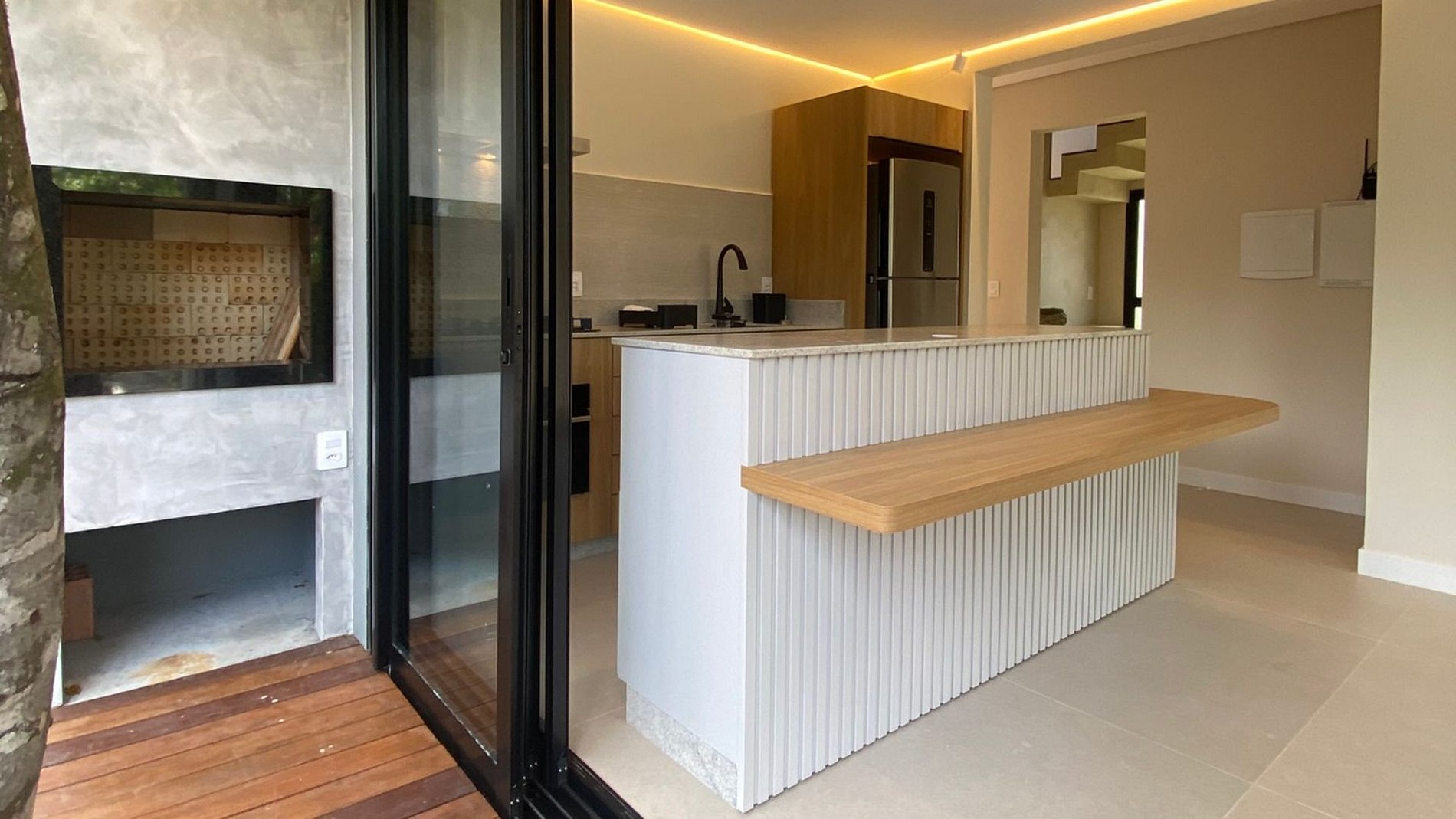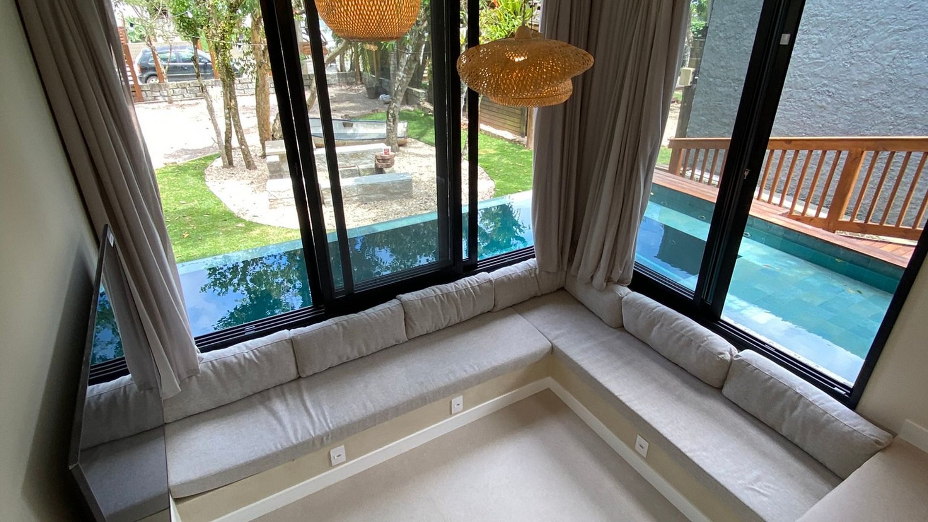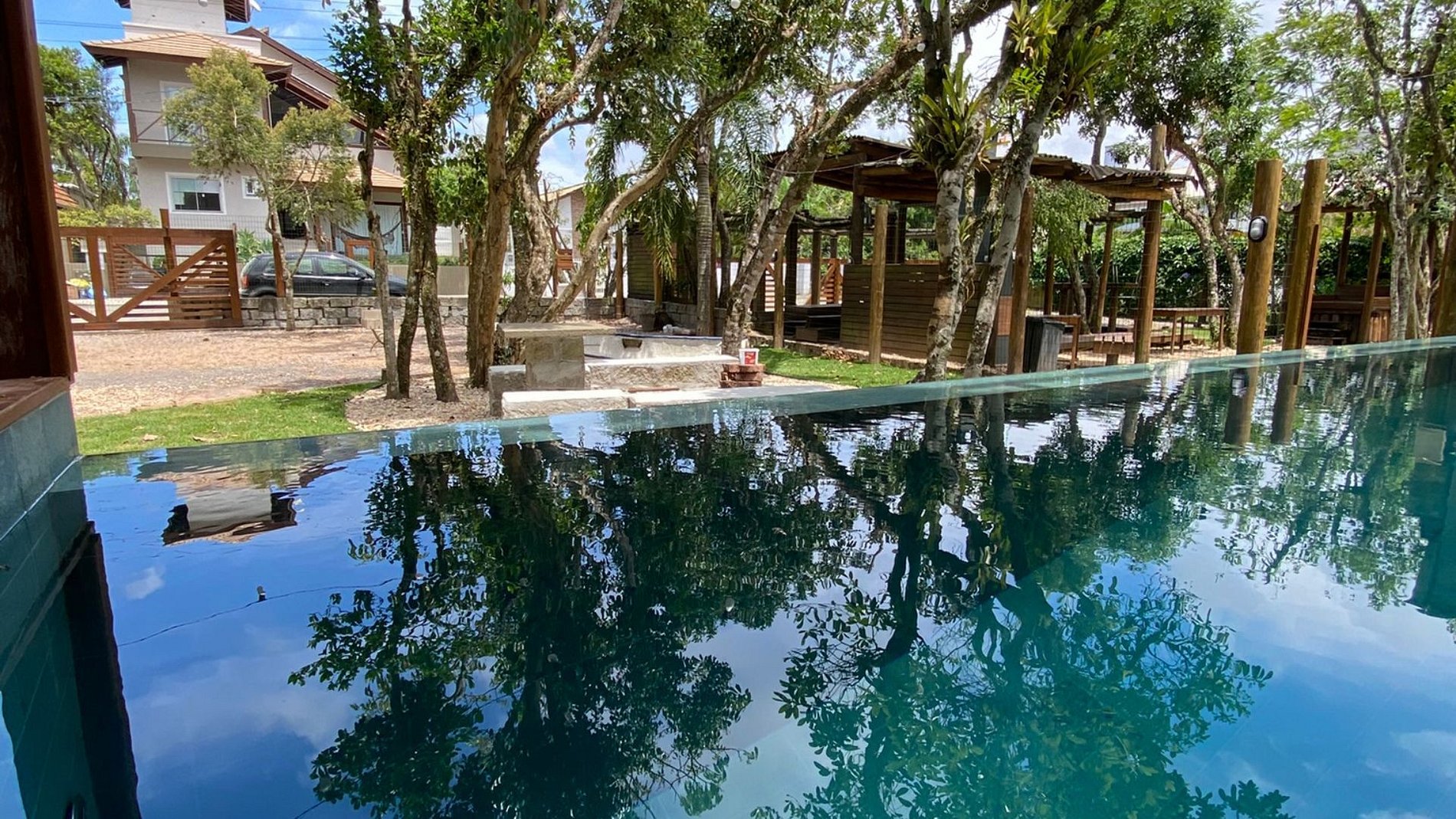 Piscina ao redor da sala + churrasqueira + jardim: social fluido e arejado