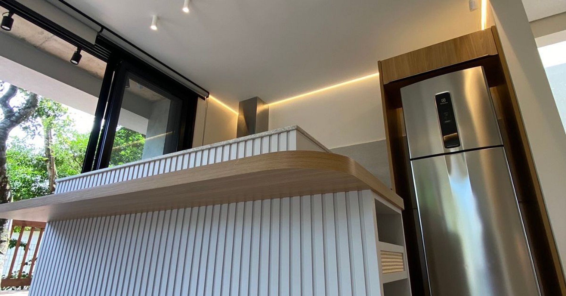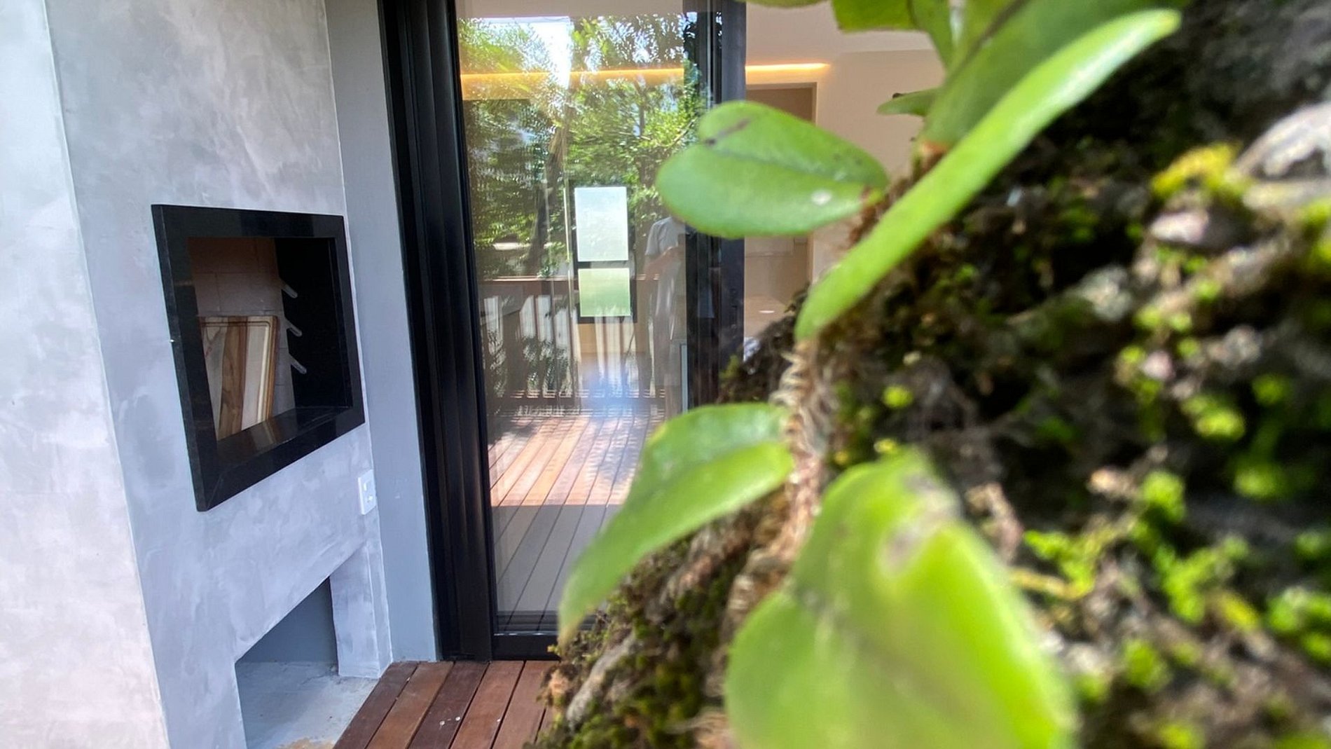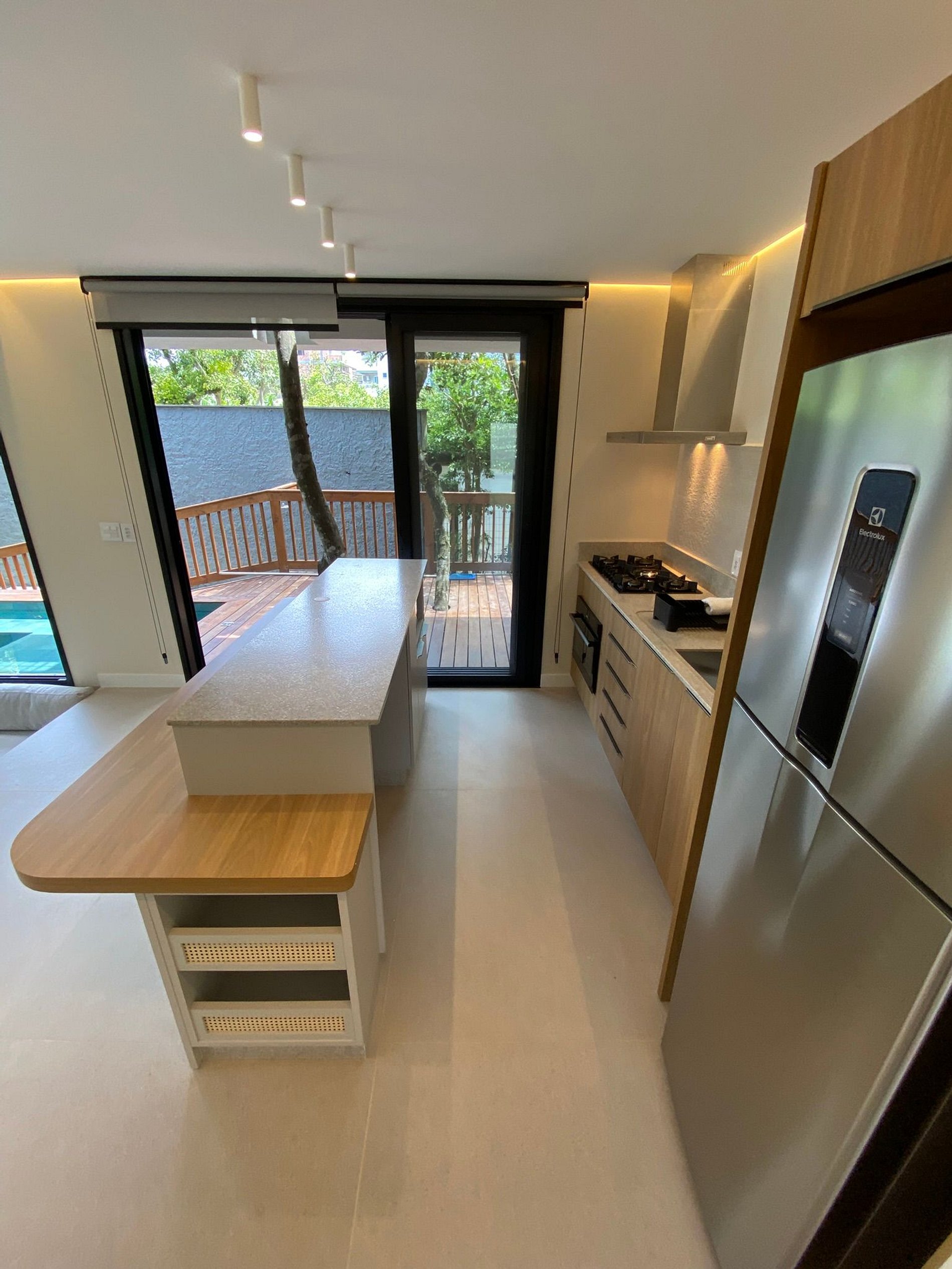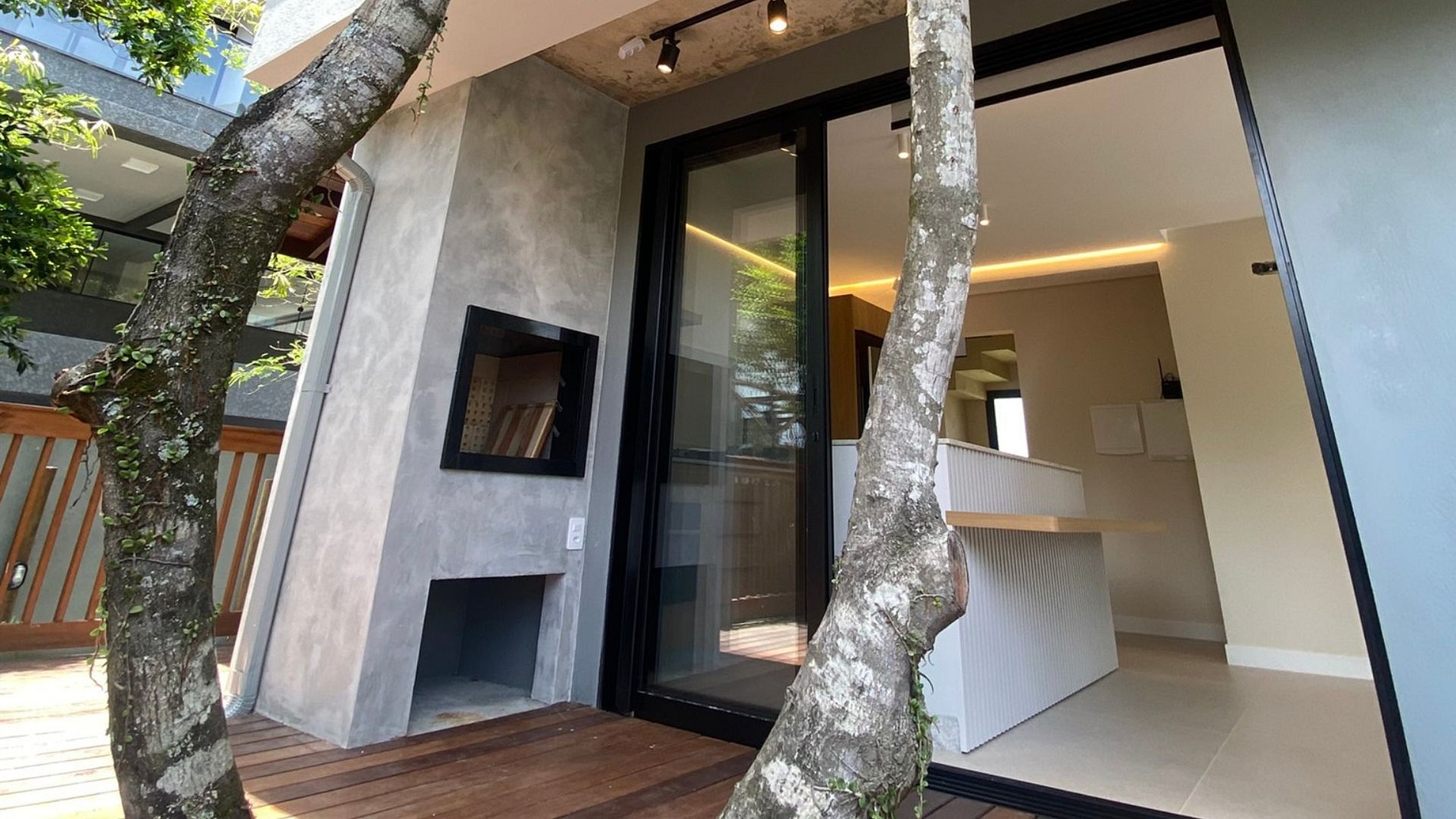 Piscina ao redor da sala + churrasqueira + jardim: social fluido e arejado