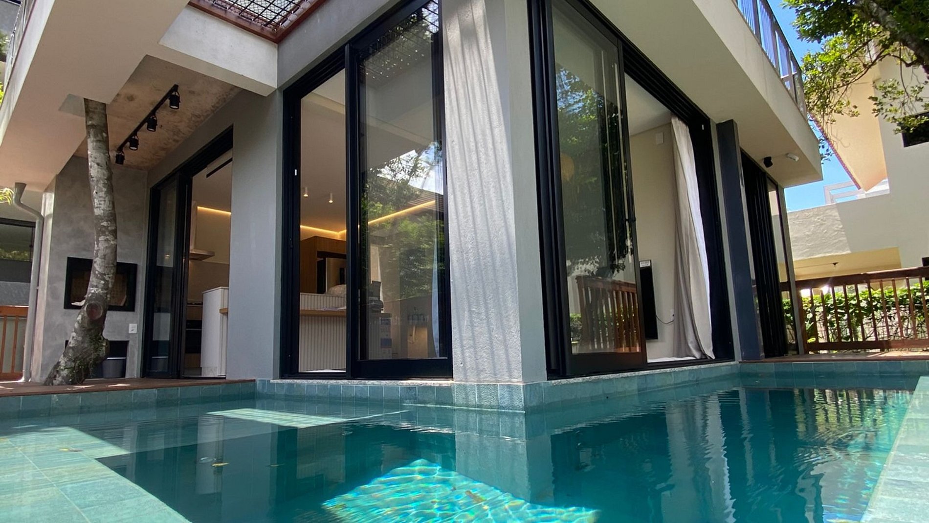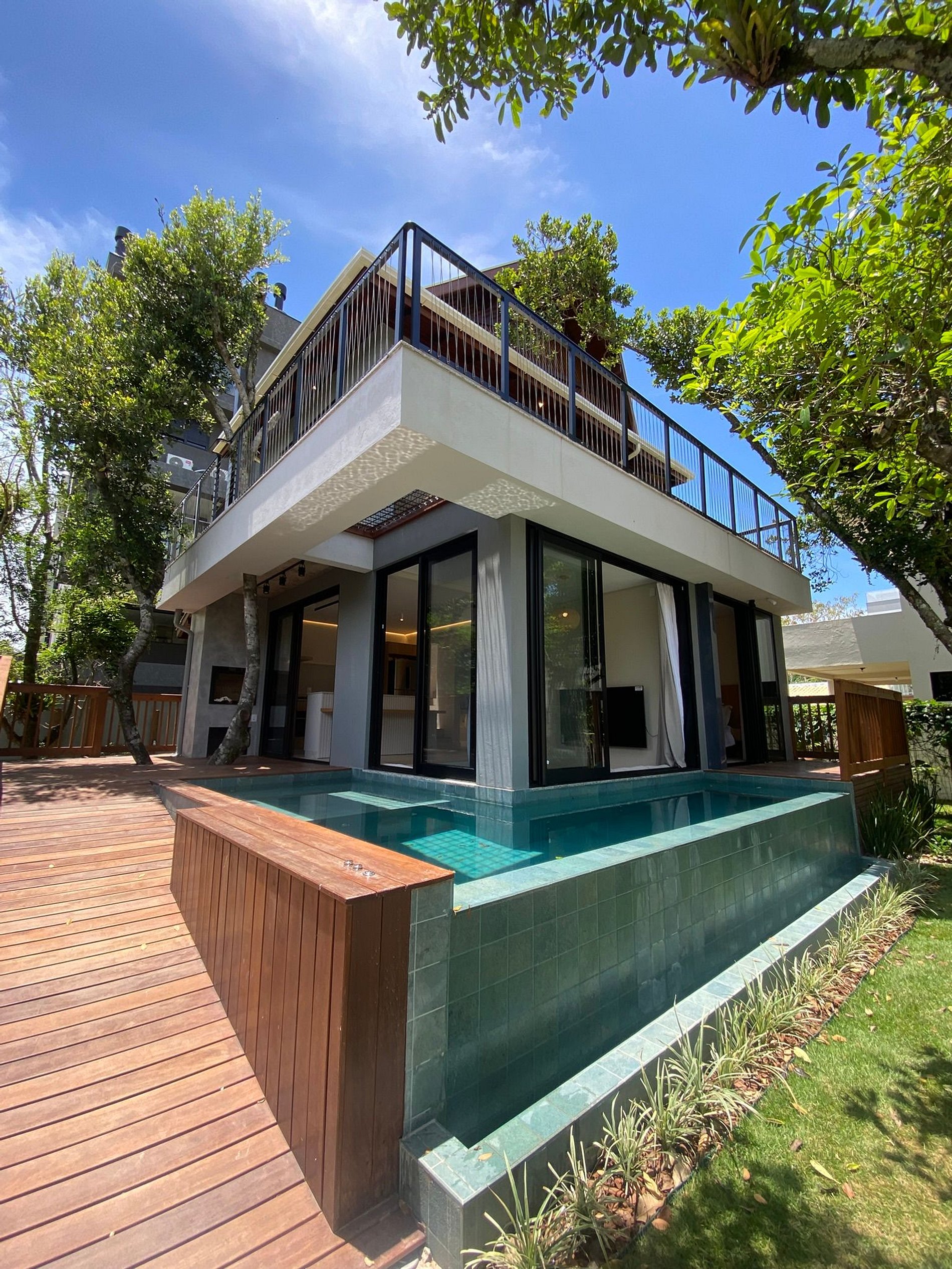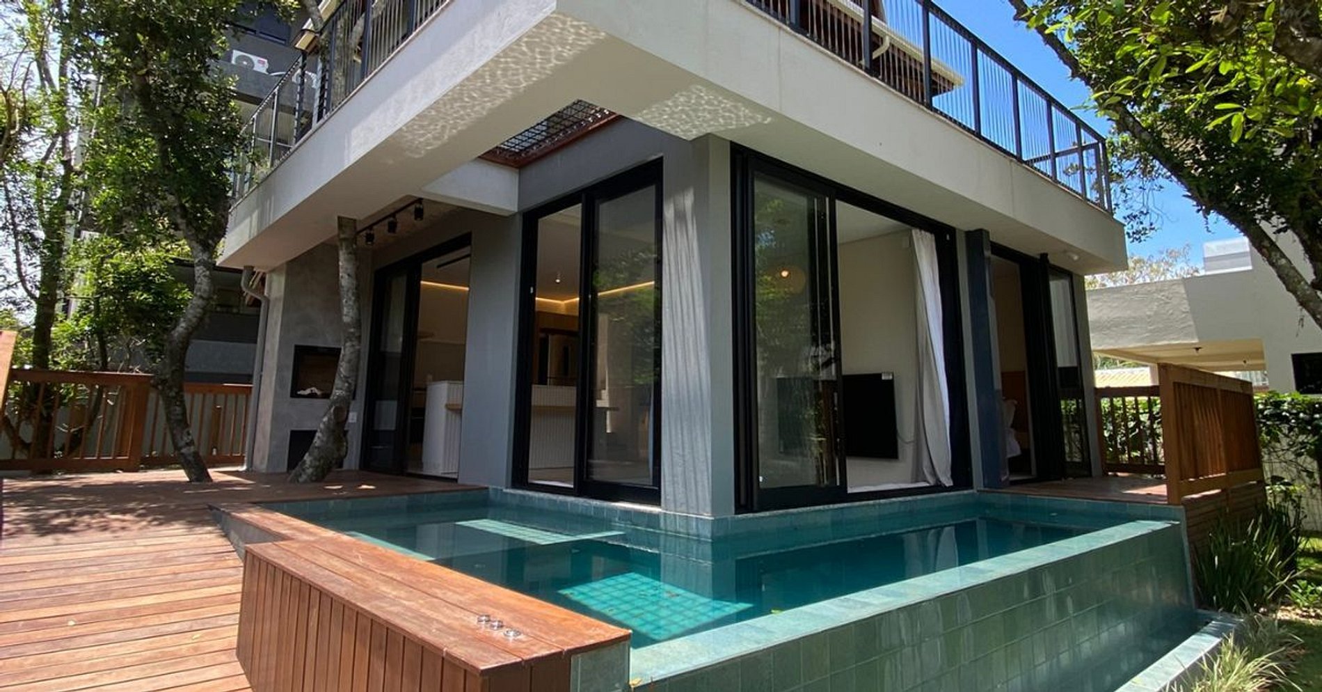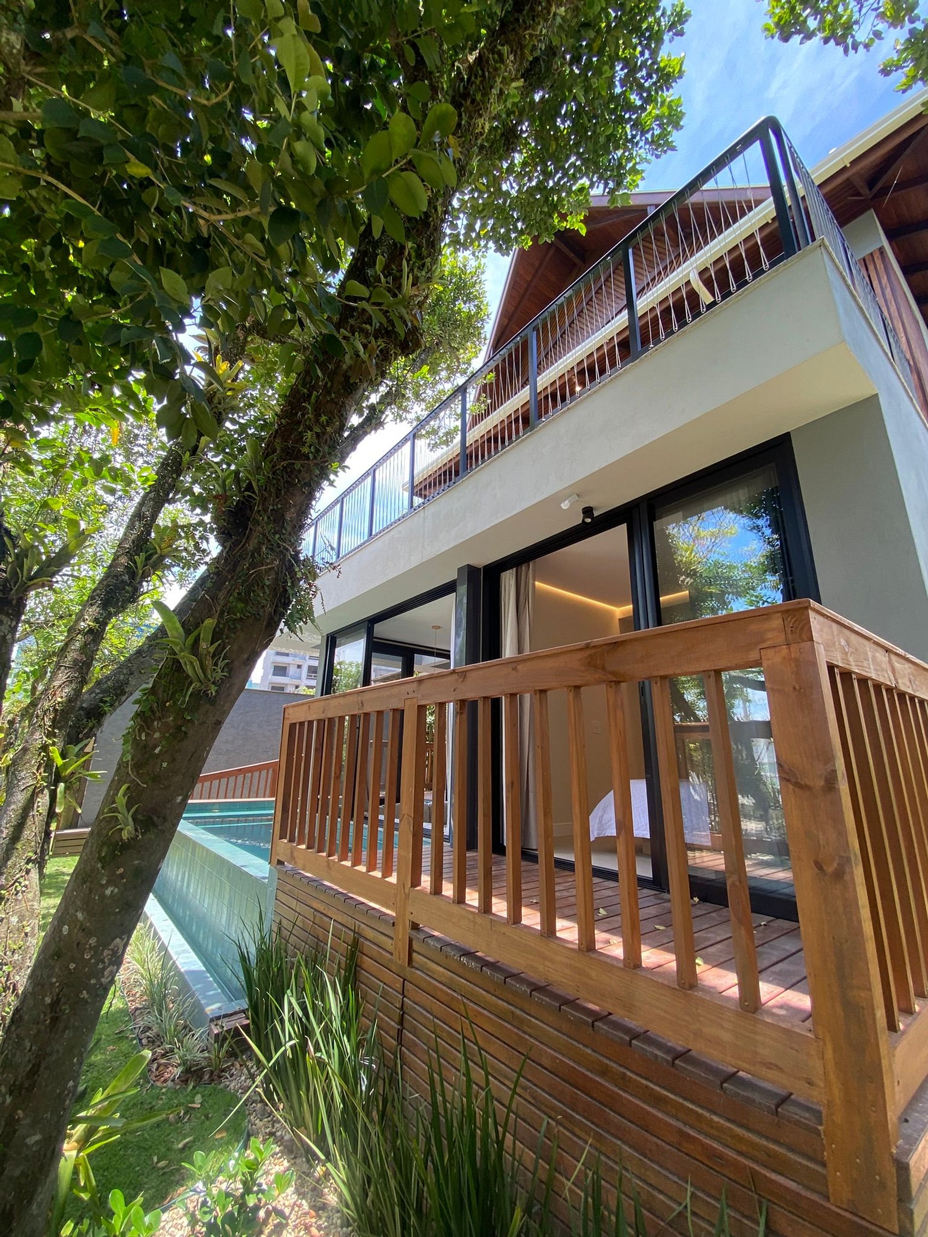 Na suíte master, a sacada tem teto verde e uma tela horizontal sobre a piscina, reforçando a sensação de integração. O quarto também possui varanda com acesso direto à piscina. No primeiro piso, são suíte master + quarto + banheiro completo.