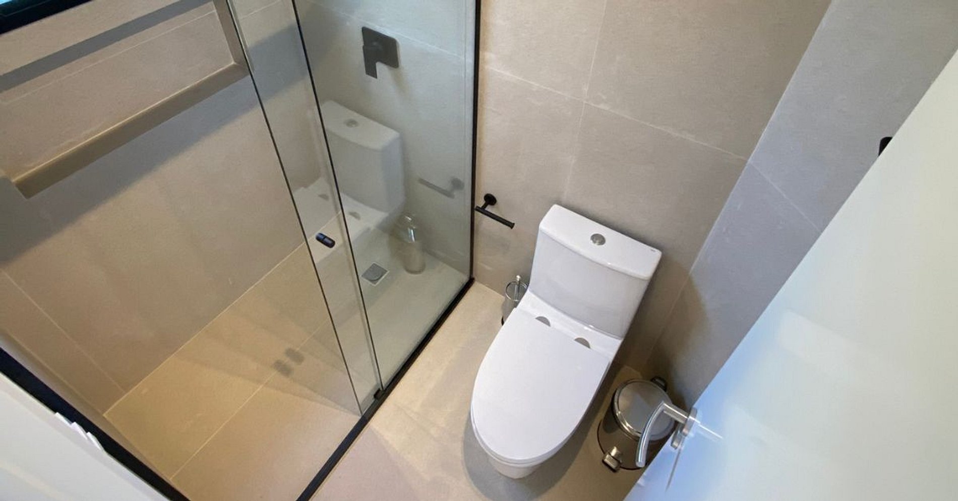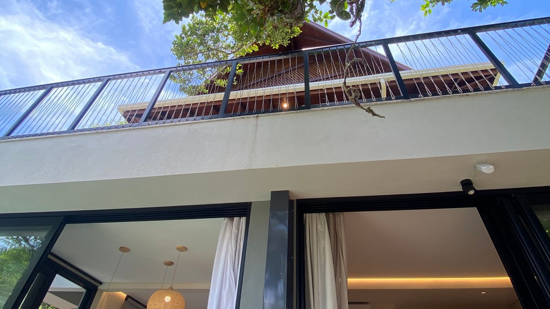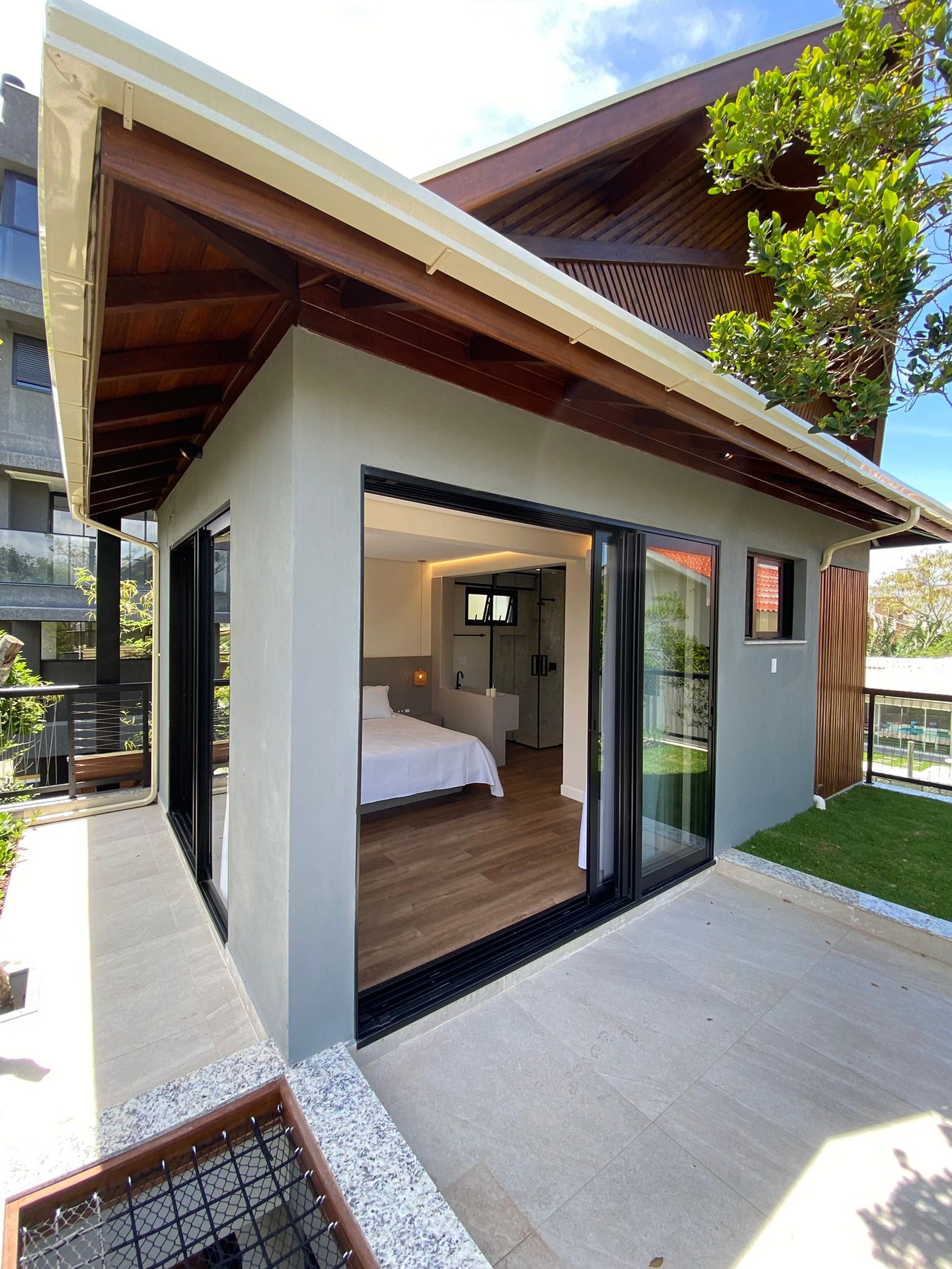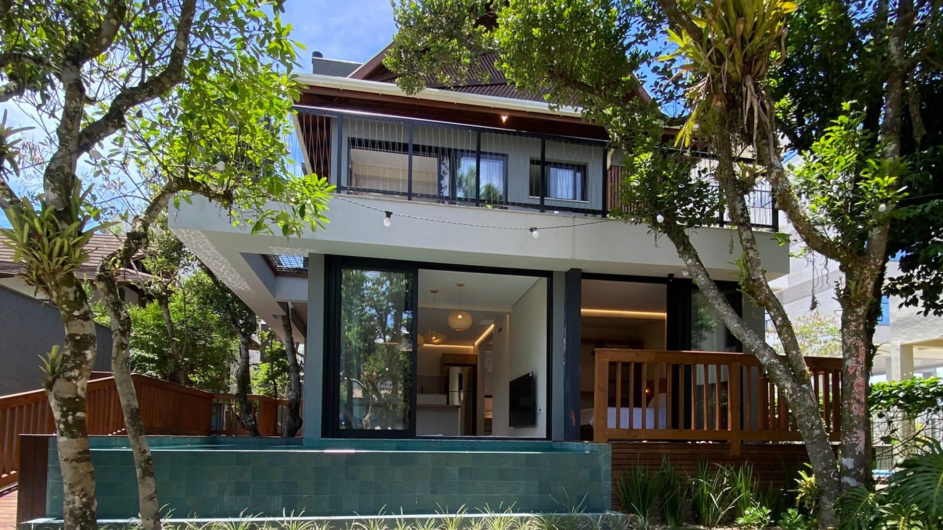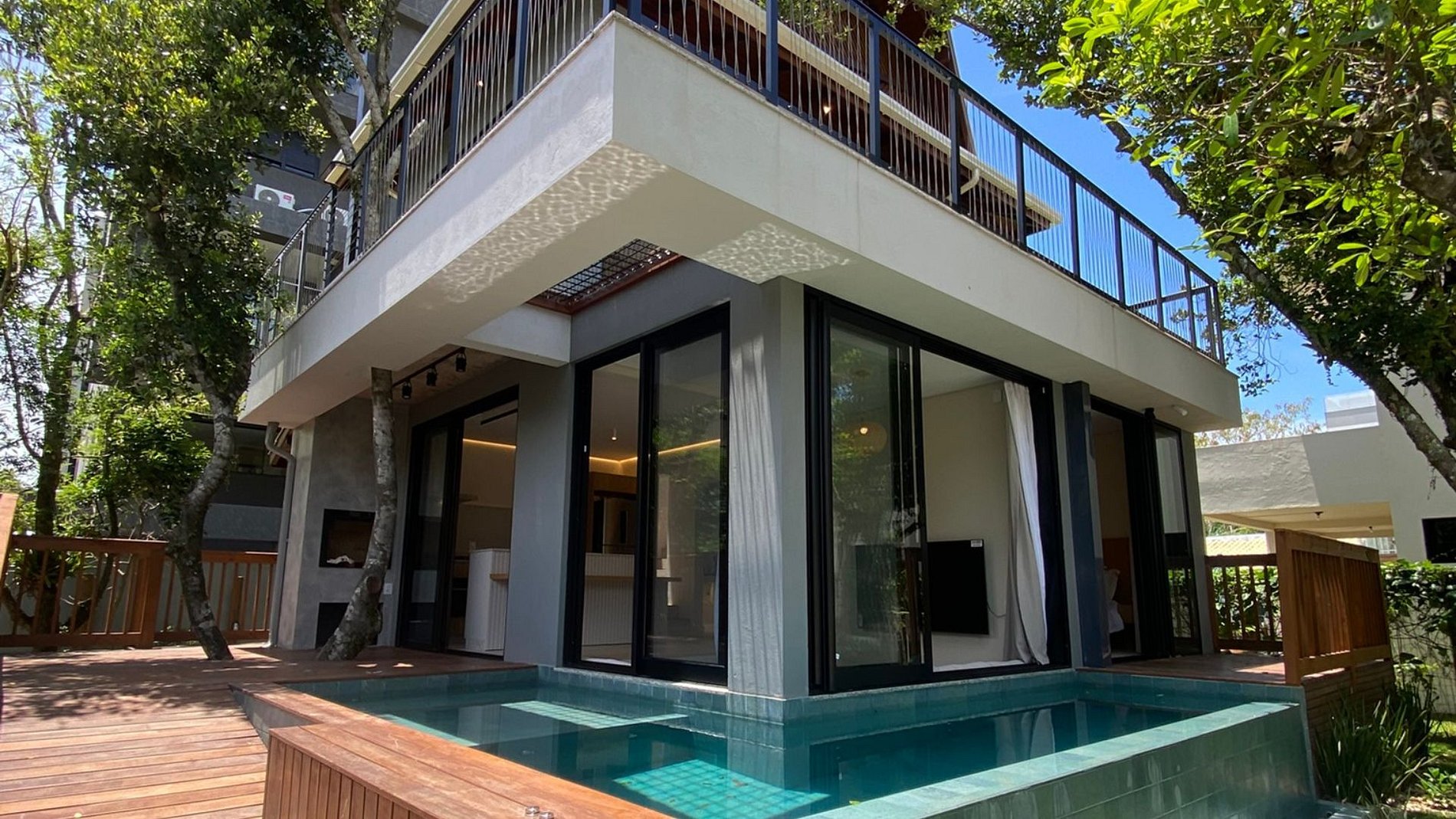 Na suíte master, a sacada tem teto verde e uma tela horizontal sobre a piscina, reforçando a sensação de integração. O quarto também possui varanda com acesso direto à piscina. No primeiro piso, são suíte master + quarto + banheiro completo.