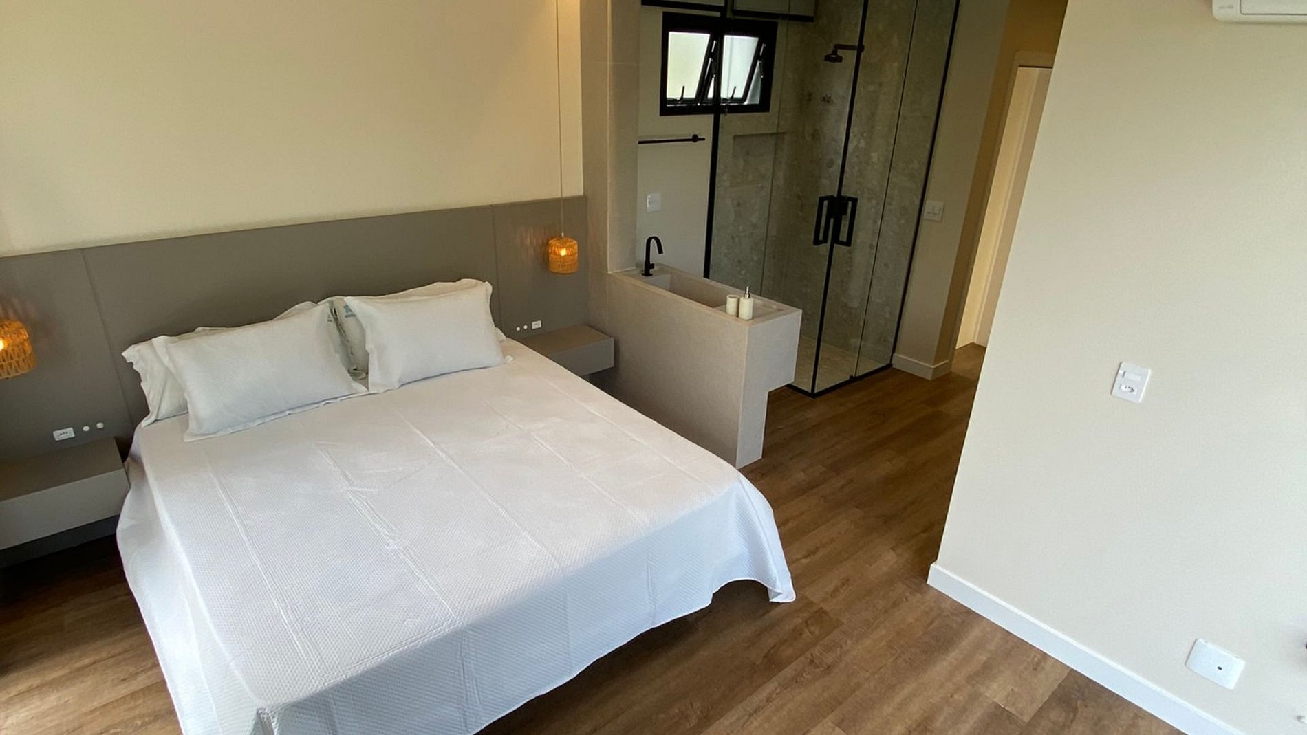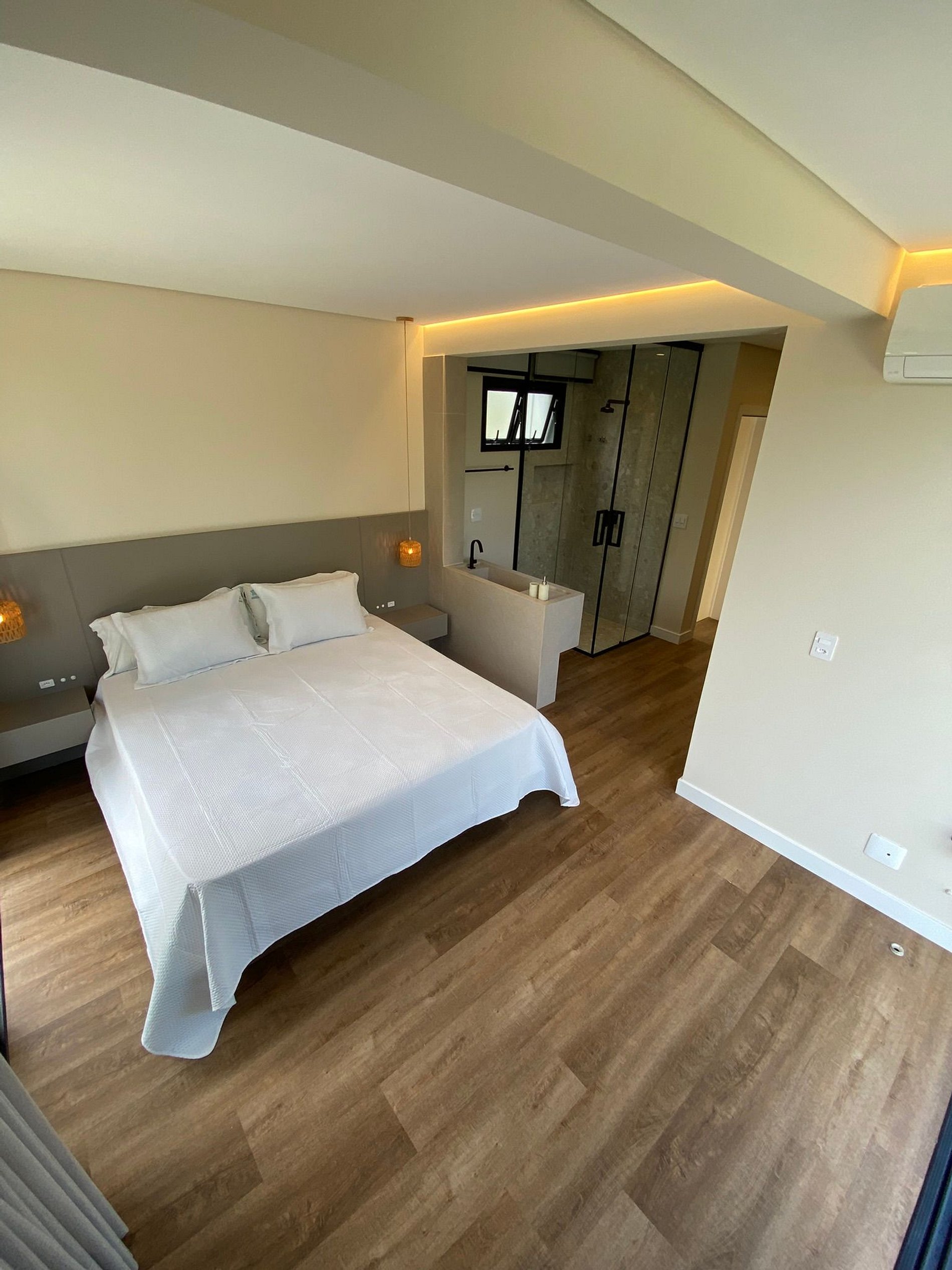 Confortos incluídos: ar-condicionado na suíte e no quarto, enxoval completo (roupa de cama e toalhas), amenities (shampoo, sabonete e papel higiênico). Do lado de fora, fogueira no chão com bancos e mesa para noites estreladas. Garagem exclusiva para até 3 carros. Disponibilizamos cadeiras de praia e guarda-sol.