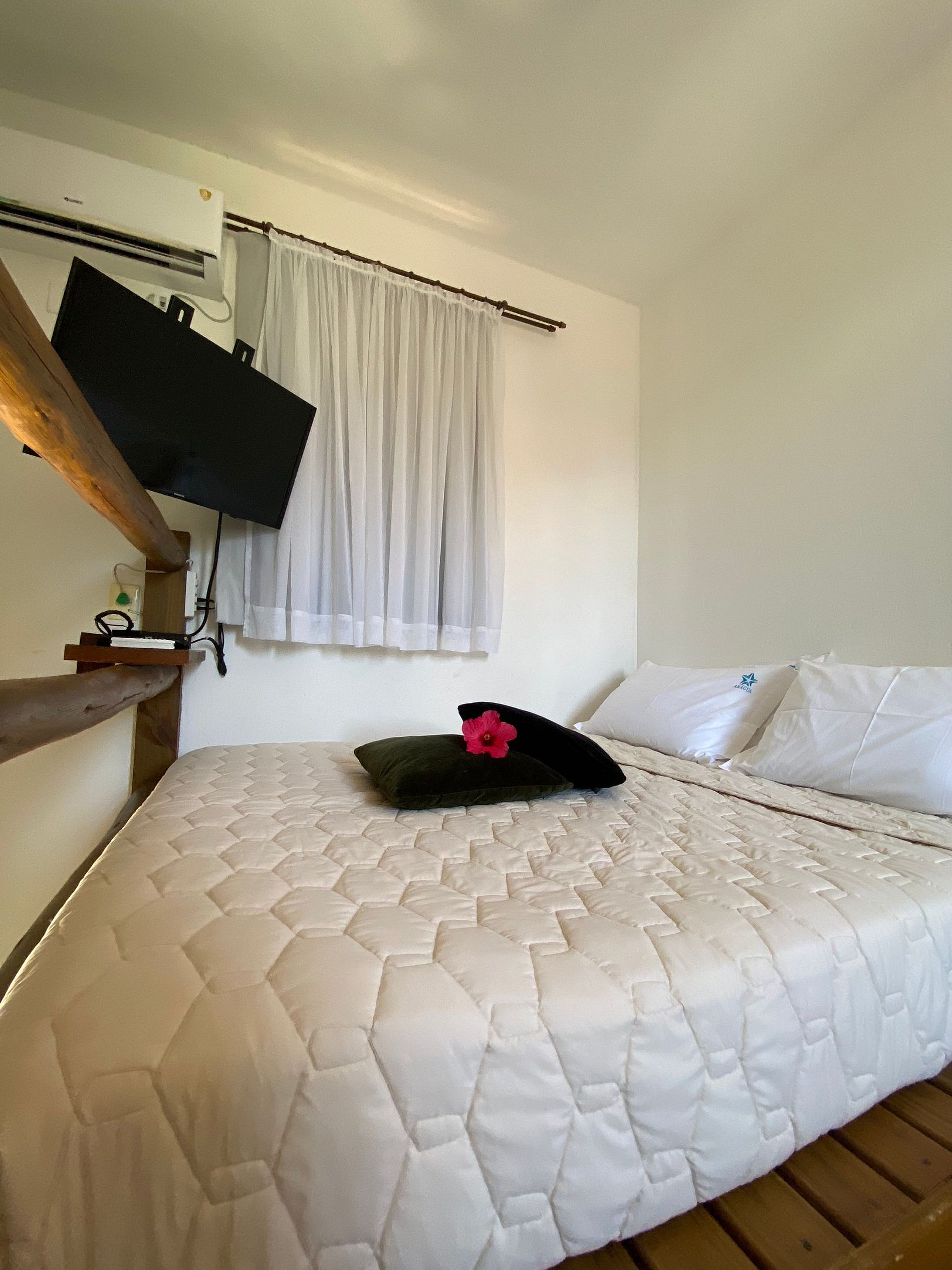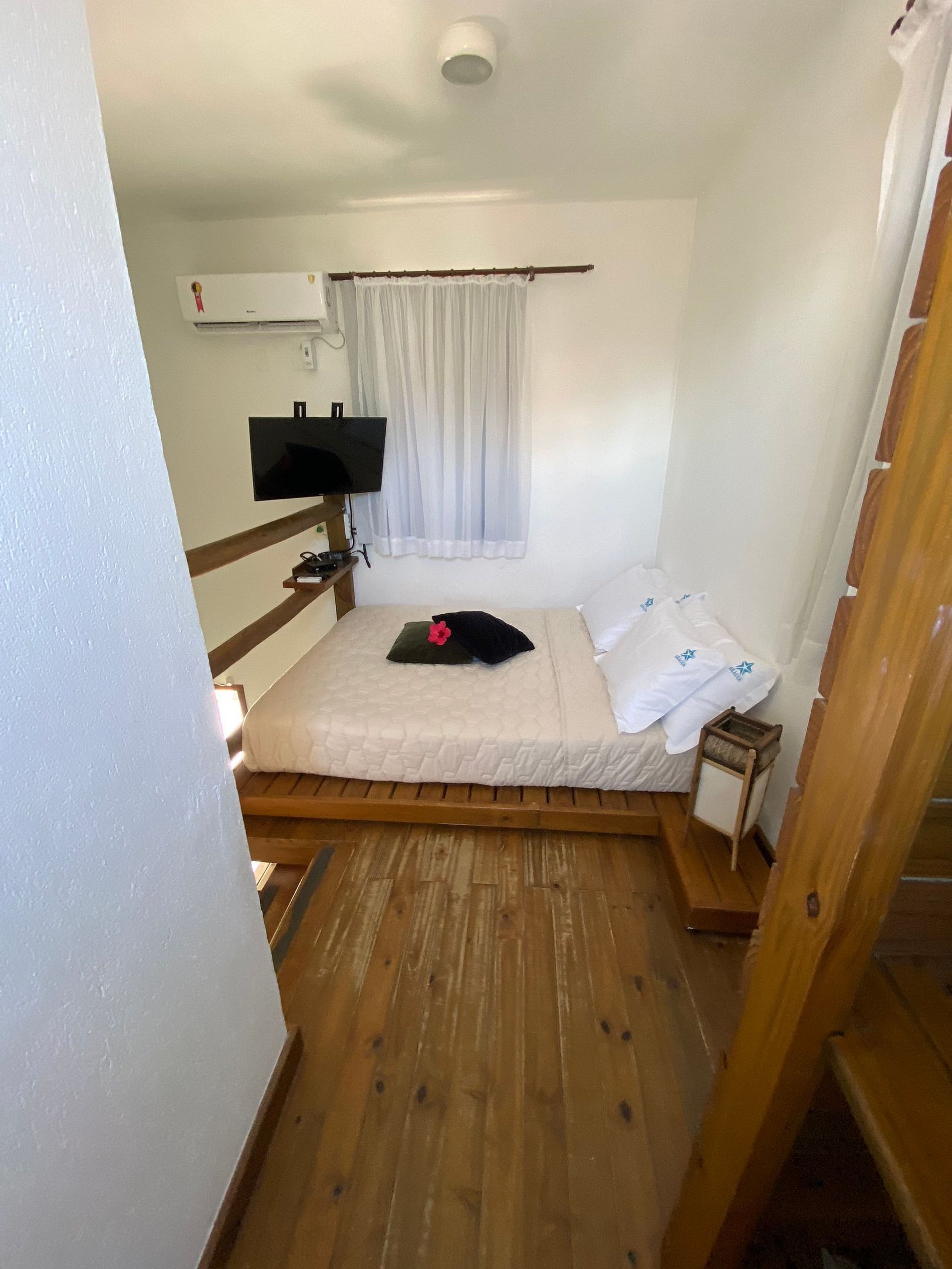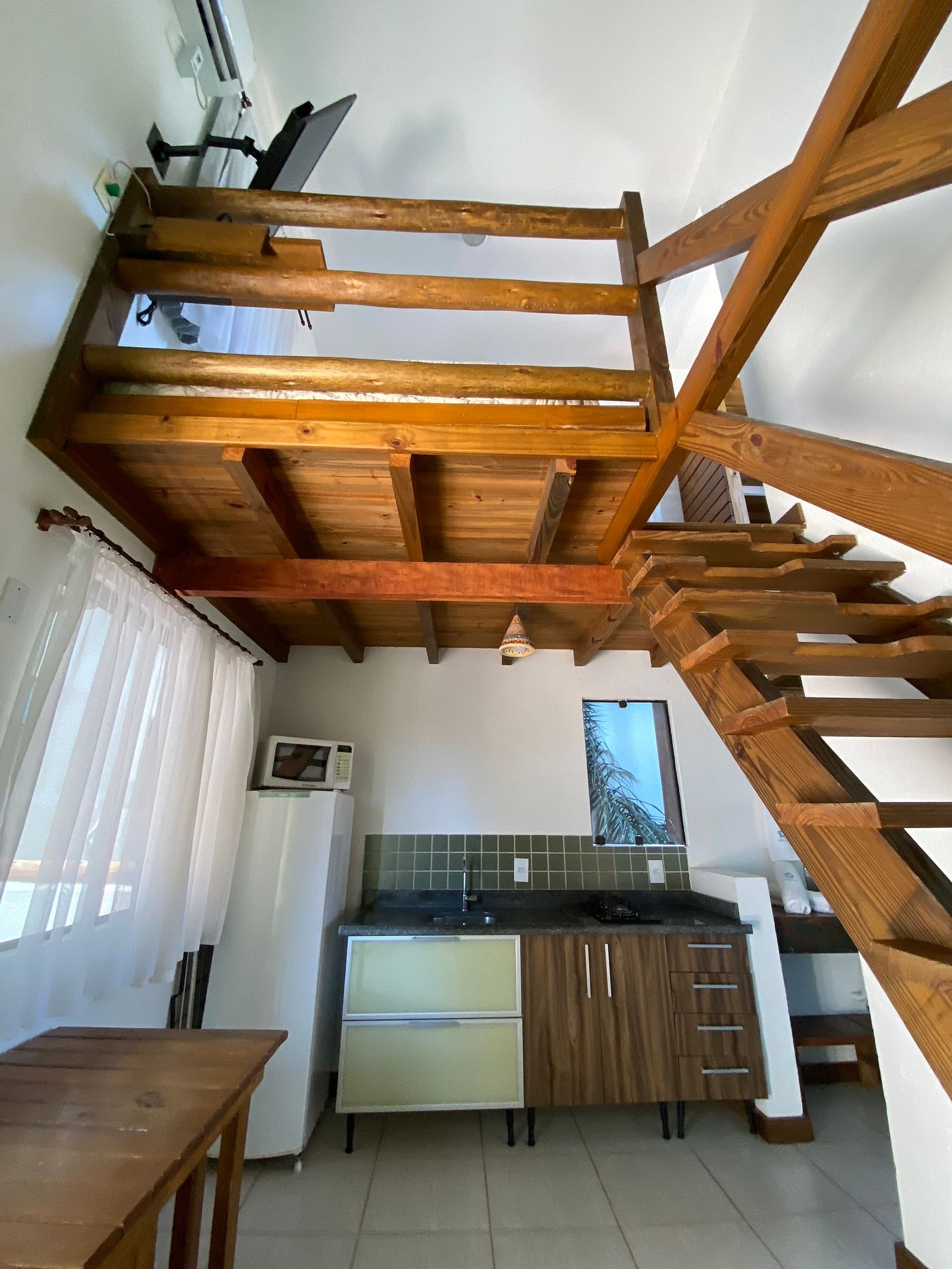 Esta unidade conta com cozinha completa, varanda e bicama de solteiro no primeiro piso. O mezanino conta com cama de casal, smart TV à cabo 32”, ar condicionado split e cofre. Para esta unidade o acesso é feito através de escada.