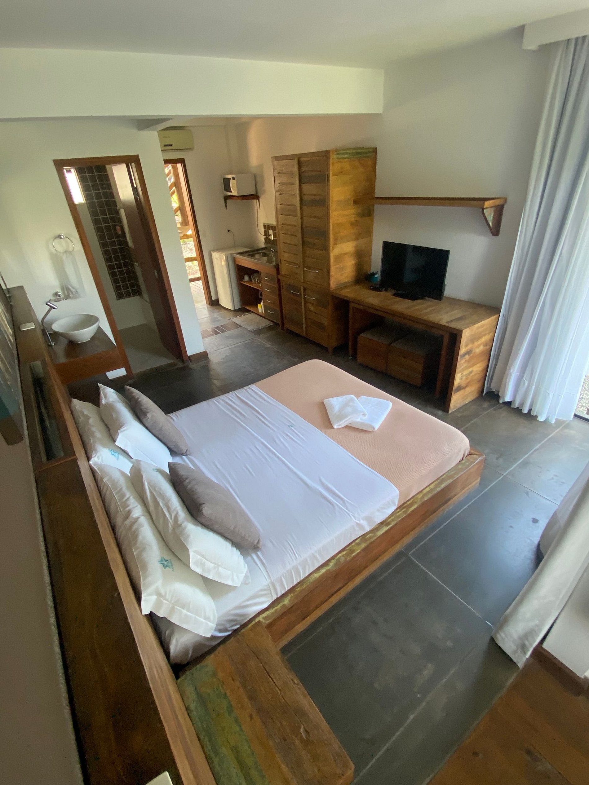 Esta unidade conta com varanda com acesso ao espelho d'água, Tv à cabo 32”, mini cozinha (microondas, geladeira, pia), ar condicionado split e cofre.